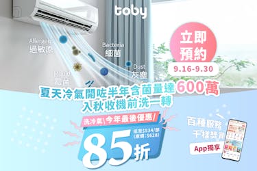由即日起至9月30日,預約Toby洗冷氣服務,仲即享額外85折優惠!讓你在享受清新空氣的同時,輕鬆省錢。每部冷氣機低至$534,還可享受多部優惠,讓你的家庭開支更加穩定!