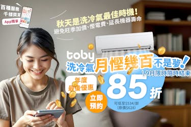 由即日起至9月30日,預約Toby洗冷氣服務,仲即享額外85折優惠!讓你在享受清新空氣的同時,輕鬆省錢。每部冷氣機低至$534,還可享受多部優惠,讓你的家庭開支更加穩定!